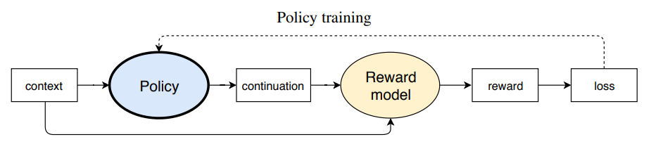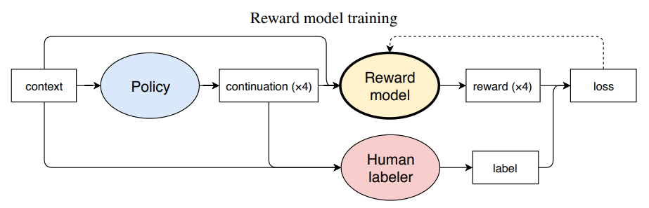 reward model 训练好后, 在训练 policy model 时, reward model 可以完全取代 human labelers 选择, 这种基于偏好的选择作为信号传给 policy model, 再使用 PPO 来训练